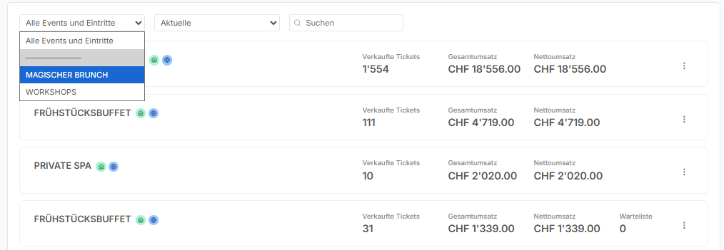 By default, all current events and admissions are listed.If there are categories for events or admissions that contain at least one upcoming event / admission, you can filter the dashboard according to these categories. Categories without events or admissions or with only past events are not available for selection.