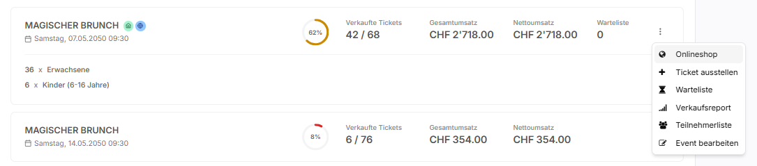 The number of admissions sold is listed before the event details (provided that you have activated admission tickets in your ticketing system).