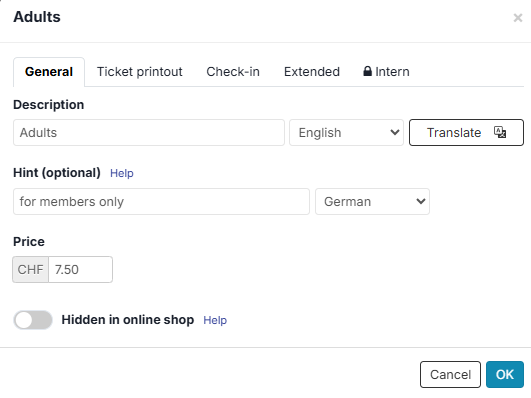 You can specify for each event or admission whether the complete or reduced check-out form is displayed in the online shop: