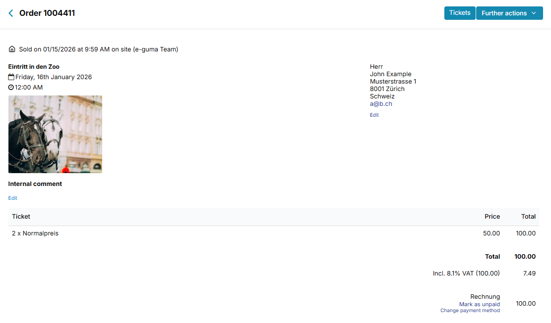 Clicking an order opens its detailed view. From there, you can reopen or print the Tickets, and use the Further Actions button to access the Receipt or Invoice at any time. Learn more about cancelling or rebooking orders, as well as comments.