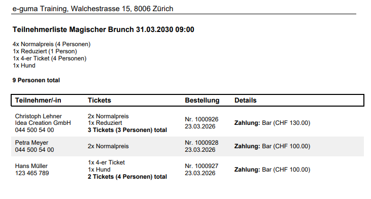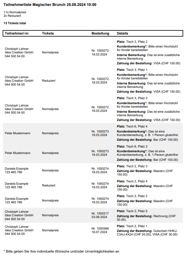 The data contained in the PDF version of the attendance list depends on the configuration of your event or admission. If personalised data is available for each ticket, it will be displayed. If there is no personalised data per ticket, the data of the person who ordered the ticket will be used.