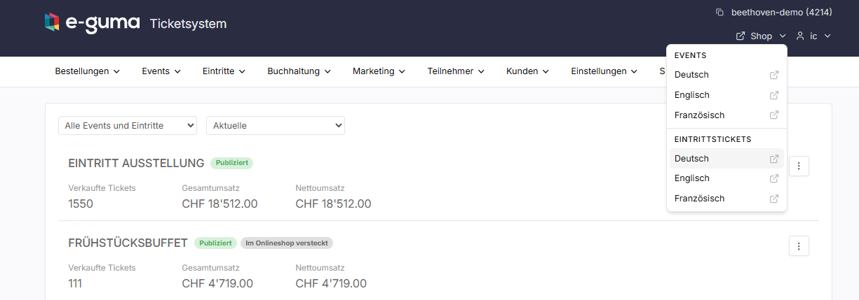 The Shop button in the e-guma header will take you to your admission ticket shop in all active languages.