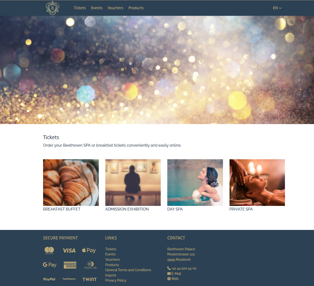 Events and admission tickets are displayed on separate landing pages. Links to all active shops can be seen in the navigation and footer.