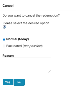 You have two options when cancelling a redemption. Normal (today) or Backdated.